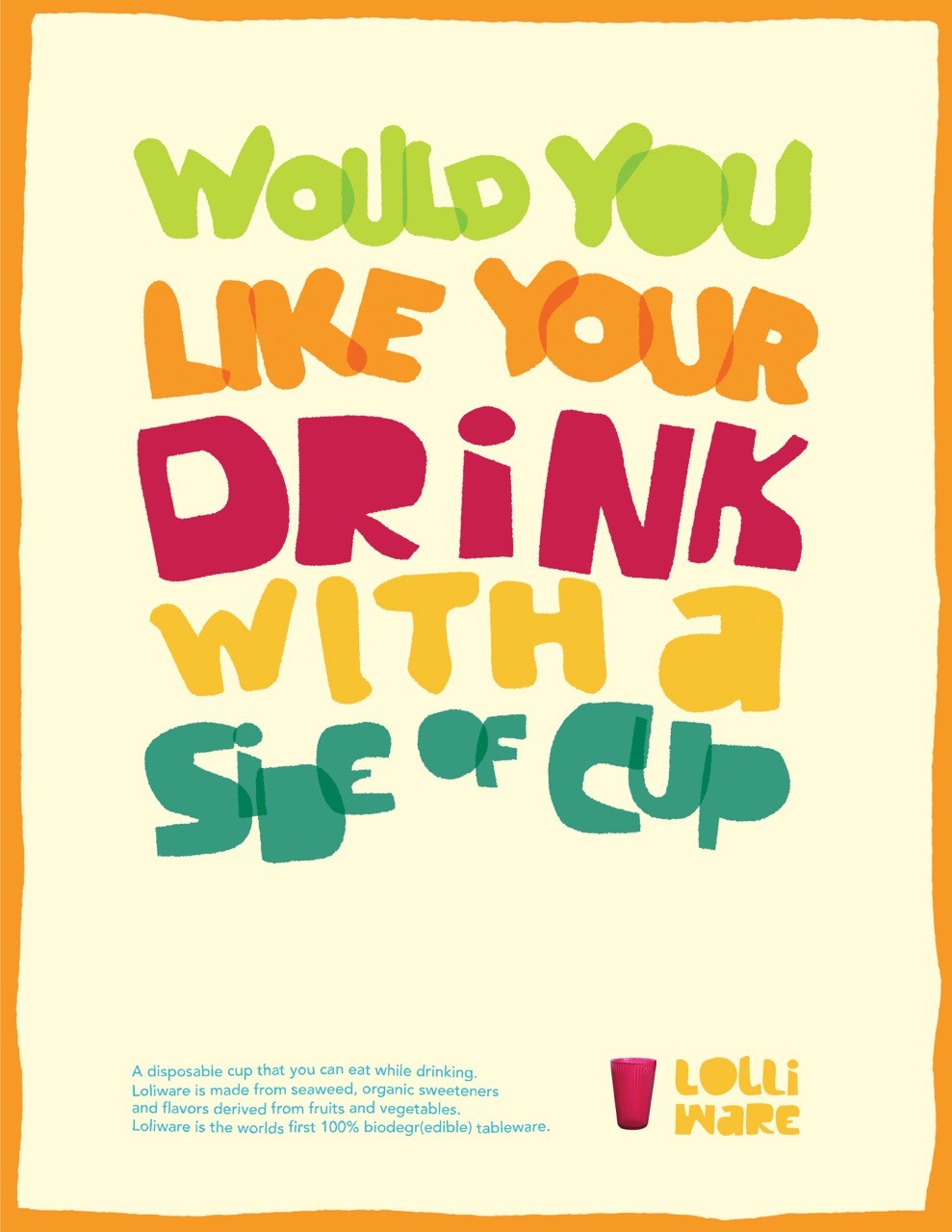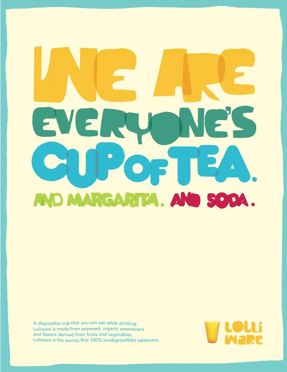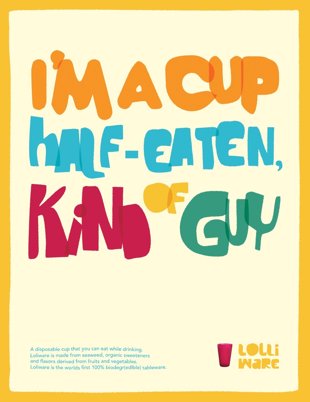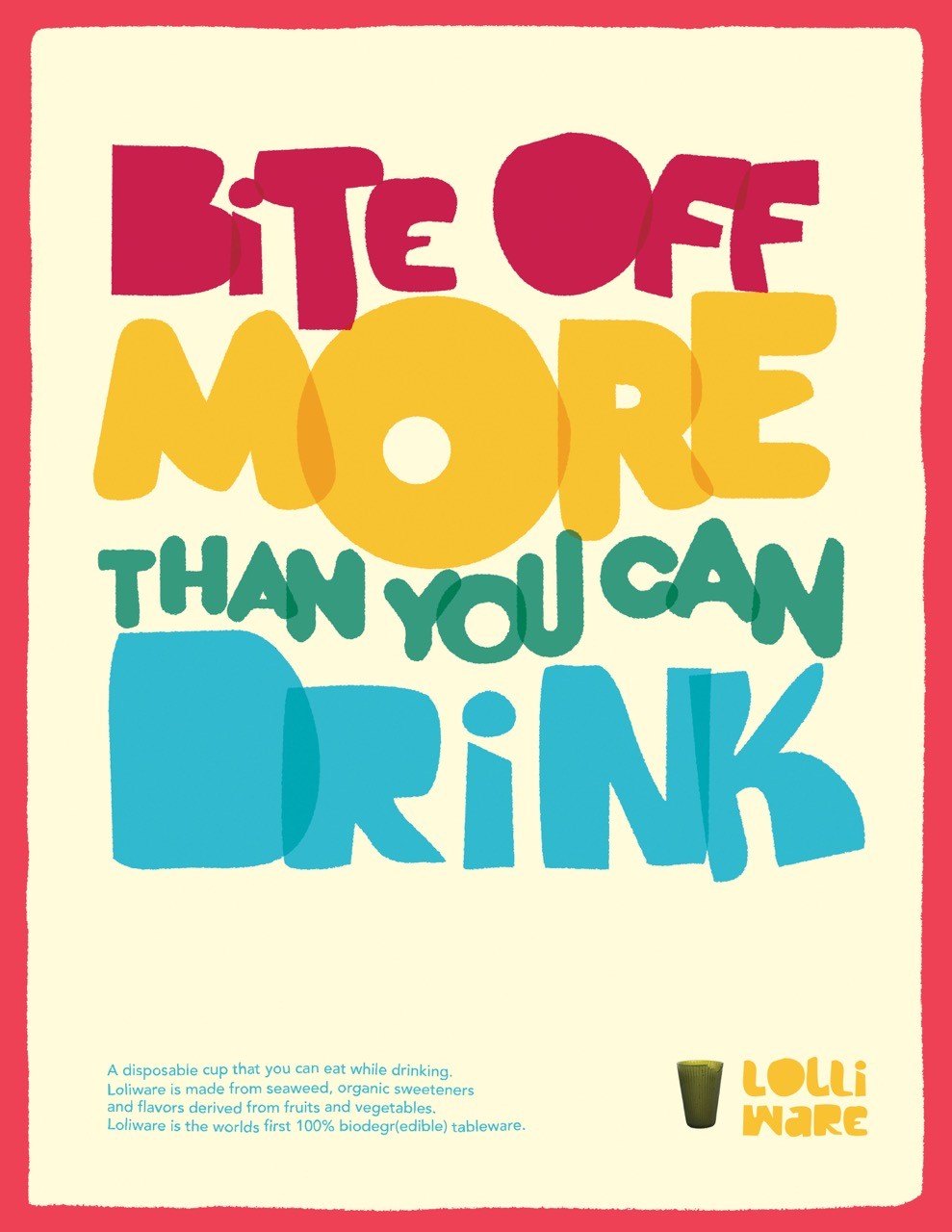 Lolliware Cups transform the everyday drink into a sustainable experience. Crafted to be 100% biodegradable and completely edible, these cups invite you to sip, savor, and then consume. Our poster series highlights their playful spirit with bold typography, vibrant imagery, and witty headlines that capture both the charm and the eco-friendly innovation behind the brand. Each design turns sustainability into something you can see, hold, and taste, making Lolliware not just a cup but a conversation starter about the future of drinking.